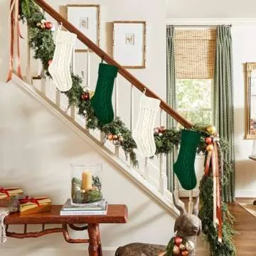 Show moreIntroducing the Kunyida 18 Inches Ivory and Green Knit Christmas Stockings – a perfect blend of traditional charm and modern usefulness. These delightful double-sided stockings are designed to bring festive cheer to your home decor during the holiday season. Made with exquisite attention to detail, each stocking measures a generous 18 inches in length and 5 inches in width, providing ample space to fill with delightful surprises. The appealing ivory and green knit patterns grace both sides, allowing you to display them in any direction, making them versatile for any setting and style.