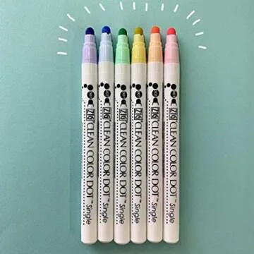 Show more The Kuretake CLEAN COLOR DOT Single Mild 6 Colors Set is a game-changer for every artist, student, and planner enthusiast alike. This innovative and versatile pen set includes six beautifully crafted, flexible dot tip markers that allow you to customize your creative expression effortlessly. With the ability to create dots in various sizes by simply adjusting the pressure applied, these pens make bullet journaling, illustration, crafting, and planner decoration a breeze. Each pen is filled with high-quality water-based pigment ink, designed to dry quickly, ensuring your work remains smudge-free and vibrant.