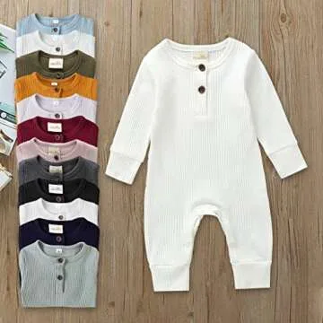 Show moreThe Kuriozud Newborn Infant Unisex Baby Boy Girl Button Solid Romper Bodysuit is the ultimate blend of style, comfort, and convenience for your little ones. Made with a high-quality cotton blend, this romper promises to be gentle on your baby’s delicate skin while providing maximum breathability. The soft and thick, yet textured fabric ensures that your baby looks adorable while staying cozy during any season. Featuring a practical design with easily adjustable buttons at the bottom and front, this outfit makes diaper changes a breeze, which any parent will appreciate. The long sleeve variant, especially in a charming pink hue, adds a cute touch that makes it ideal for both baby boys and girls up to 18 months old!