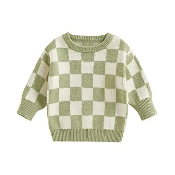 Show more Introducing the **Kuriozud Toddler Baby Boy Girl Sweater** - a charming blend of comfort and style designed specifically for your little ones! Crafted from a soft cotton blend, this adorable knit sweater offers skin-friendly properties, ensuring that your child stays warm and cozy during those chilly fall and winter months. The elegant plaid print adds a trendy touch, while the long sleeves and crewneck design provide optimal warmth and snugness. The loose style not only looks cute but also allows for ease of movement, making it perfect for active babies.