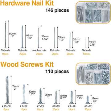 Show moreIntroducing the KURUI Hanging Nails and Wood Screws Assorted Kit, a comprehensive collection that combines quality, variety, and organization for all your home improvement and DIY needs. This robust kit includes a total of 256 pieces, featuring 110 Phillips flat head screws and 146 picture hanging nails meticulously categorized into various sizes. The set is packaged in a durable, transparent organizer box that makes locating and storing your hardware an absolute breeze. With meticulous attention to craftsmanship, the KURUI kit not only meets but exceeds industry standards, ensuring your projects are completed efficiently and effectively.