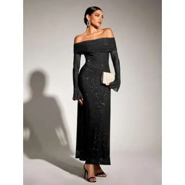 Show more Introducing the stunning KUTUMAI Women Off Shoulder Bodycon Maxi Dress, designed for the modern woman who wants to make a statement at any event. Crafted from high-quality stretch mesh fabric, this cocktail party dress not only provides ultimate comfort but also ensures a tailored fit that flatters your figure beautifully. Each color is lined, meaning you can move with confidence without the fear of any see-through mishaps. The eye-catching off-the-shoulder design, complemented by sheer long sleeves and attractive ruched detailing, creates a sultry yet elegant silhouette perfect for weddings, parties, or any semi-formal occasion. This versatile dress can be dressed up with heels and statement jewelry for a glamorous look or dressed down for a chic day event.