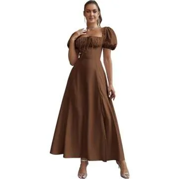 KUTUMAI Women's Summer Off Shoulder Maxi Dress Puff Sleeve A Line Flowy Ruffle Swing Split Long Dresses Brown XL