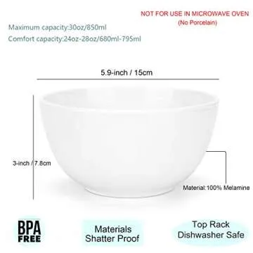 KX-WARE Melamine Bowls with Lids set - 28oz 6inch 100% Melamine Cereal/Soup/Salad Bowls, Set of 6 White | Shatter-Proof and Chip-Resistant Dishwasher Safe, BPA Free