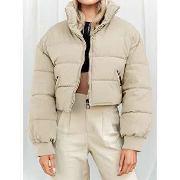 KYL Women's Winter Cropped Puffer Jacket Oversized Zip-Up Quilted Puffy Short Down Coat Beige Small