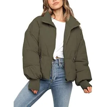 Show moreIntroducing the KYL Women's Winter Puffer Jacket, an essential piece for your winter wardrobe that combines both style and functionality. This oversized zip-up quilted puffy bubble short down coat comes in a chic army green color, offering a modern twist on the classic puffer silhouette. Designed with your comfort in mind, it features a slightly cropped cut, perfect for layering, and long sleeves that ensure you stay warm without sacrificing style. The stand-up collar adds a touch of flair while providing extra protection against the chill.