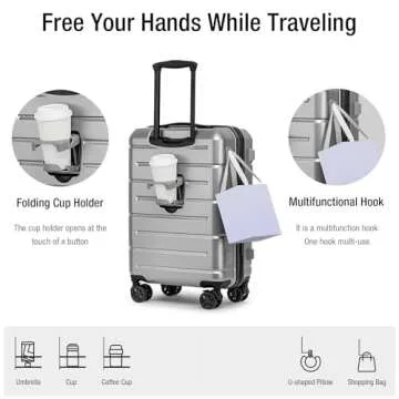 KYME Hardside Carry On Luggage 22x14x9 Airline Approved,22 Inch Hard Shell Suitcase with Double Spinner Wheels TSA Lock,Travel Rolling Luggage with Cup Holder for Men Women,Silver