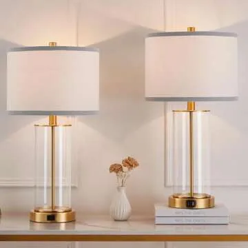 Show moreIlluminate your living spaces with the Kyrid 23.5'' Glass Table Lamp Set, a striking combination of style and functionality. Crafted with a refined antique brass finish, these lamps feature stunning blown glass bodies that promise to elevate the aesthetic of any room. Each lamp stands tall at 23.5 inches and is highlighted by a cream-colored linen shade, providing a warm and inviting glow perfect for creating a cozy atmosphere. Designed with versatility in mind, the lamps possess a 2-way lighting setting that allows you to easily control the brightness according to your needs, whether it’s for reading, working, or simply enjoying a relaxing evening.