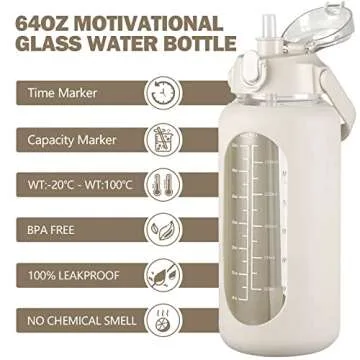 Show more Introducing the kytffu 64oz Glass Water Bottles with Straw, the perfect blend of functionality and style that encourages hydration throughout your day. This half-gallon motivational glass bottle boasts a unique design featuring a pop-up straw lid, making it effortless to sip your water on-the-go. With its advanced one-click button, just push to pop open the straw, allowing for easy access to hydration anytime, anywhere. Crafted from premium borosilicate glass, this bottle is not only durable and resistant to thermal shock but also 100% leakproof and dustproof, keeping your drink fresh and clean. The added time markers ensure that you stay on track with your daily water intake.