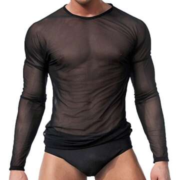 L'ASHER Men Sexy Comfy Exotic Transparent Mesh Long Sleeve T-Shirt Undershirt Nightwear (US M/Asia Tag XL, Black)