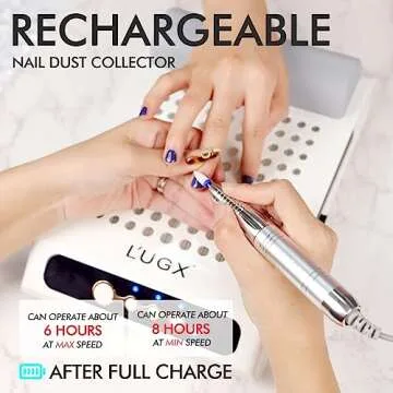 Show more Transform your nail art experience with the L'UGX Rechargeable Nail Dust Collector, a revolutionary device designed to keep your workspace immaculate and elevate your nail care routine. This innovative product is more than just a dust collector; it's a game changer for nail technicians and enthusiasts alike. The elegance of its design, coupled with a large-capacity lithium-ion battery, allows for up to 8 hours of cordless operation, making it incredibly convenient for both professional environments and at-home use.
