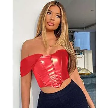 L'VOW Women's Sexy PU Leather Mesh Bustier Off Shoulder Boned Tank Top Backless Corset Crop Top (Red, M)