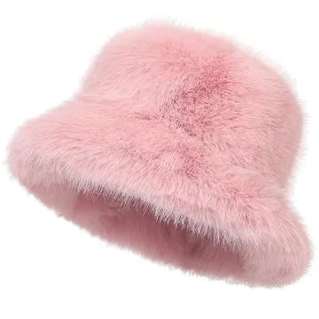 LA CARRIE Women's Fuzzy Wide Brim Faux Fur Bucket Hat Winter Warmer Fisherman Cap (Pink)