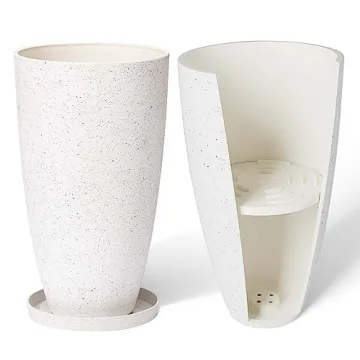 Show more Introducing the LA Jolie Muse 20 Inch Tall White Planters, a stunning set that beautifully blends style and functionality for your indoor or outdoor spaces. Crafted with a commitment to sustainability, these planters are made from premium recycled plastic mixed with natural stone powder, delivering both durability and a chic aesthetic. Whether you're using them as flower pots or unique umbrella stands, their impressive dimensions—11.4 inches in diameter and 20 inches in height—make them perfect for showcasing a variety of plants. Their elegant design and modern finish ensure they complement any decor, elevating your gardening endeavors like never before.