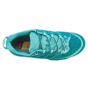 Show moreConquer the trails like never before with the La Sportiva Women's Akyra Mountain Running Shoe. Designed for the avid mountain runner, this shoe balances stability and cushioning for rugged terrains. With an eye-catching Emerald/Mint colorway, the Akyra combines high-performance materials with an innovative design, allowing you to navigate challenging landscapes effortlessly. Its lightweight yet durable construction ensures comfort during long runs, while the specialized outsole provides exceptional traction on varied surfaces.
