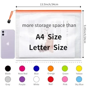 Show moreIntroducing the LABUK 52 pcs Mesh Zipper Pouch Set, your ultimate solution for a clean and organized lifestyle! These vibrant pouches come in 12 assorted colors, perfect for helping you easily distinguish and organize your files, classroom items, travel storage, and craft supplies. With dimensions of 13.5x9.5 inches (34x24 cm), they are expertly designed to accommodate both Letter and A4 sized documents, making these pouches essential for anyone looking to streamline their storage.