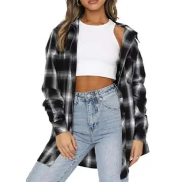 Lacozy Womens Plus Size Flannel Buffalo Shirt Long Plaid Button Up Shirt Fall Base Coat Black XX-Large
