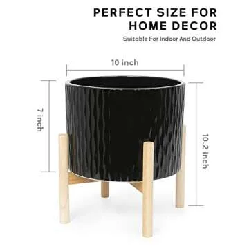 LaDoVita Ceramic Plant Pot with Stand, 10 Inch Planter with Wood Shelf, Modern Round Flower Pots Indoor with Wood Planter Holder, Black Water Ripple Pattern