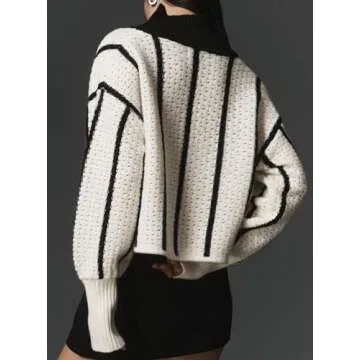 Ladyful Women's Tie Front Striped Cardigan Sweater Cropped Long Sleeve Crochet Tops Loose Ribbed Knit Fall Outfits White