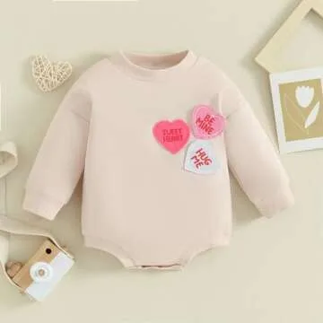 LAGKIYOJ Baby Girl Valentines Day Outfit Heart Embroidery Bubble Romper Long Sleeve Crewneck Sweatshirt Infant Spring Clothes (Apricot Heart, 12-18 Months)