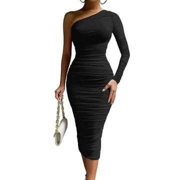 Show moreIntroducing the gorgeous LAGSHIAN Women's Elegant Bodycon One Shoulder Long Sleeve Ruched Midi Cocktail Party Dress in striking black, a must-have addition to your wardrobe that's designed to impress. This dress combines sophistication and sensuality, featuring a one-shoulder design that enhances your neckline while subtly showcasing your silhouette. Crafted from a luxurious blend of polyester and spandex, it provides exceptional stretch and comfort that hugs your curves flawlessly. The elegant ruched detailing not only flatters every body shape beautifully but also adds a forgiving element that ensures you look fabulous from every angle.