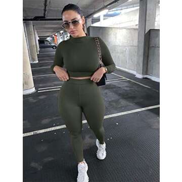 LAGSHIAN Women's Sexy 2 Piece Outfits Jumpsuit Set Long Sleeve Crop Top High Waist Pant Olive