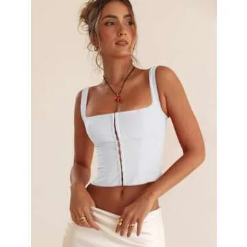 LAGSHIAN Women's Sleeveless Square Neck Double Layer Crop Top Central Single Row Clasp Trendy Tank Top White