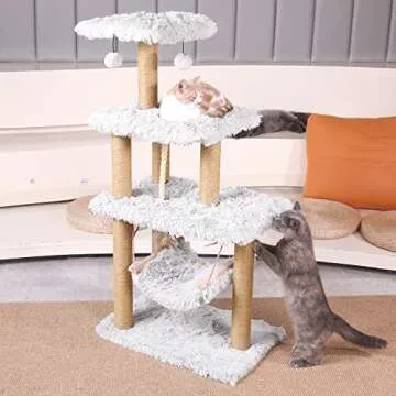Show moreWelcome to a world of feline fun and comfort with the Lahas Cat Tree for Indoor Large Cats. Standing at an impressive 45 inches tall, this multi-level cat tower is designed for cats of all ages, offering a delightful sanctuary where they can play, scratch, and rest. Crafted from high-quality particle board, this cat tree features a soft, skin-friendly Babylon plush covering that provides a cozy resting space for your fur babies. The sturdy design includes reinforced scratching posts wrapped in natural jute rope, allowing your cats to sharpen their claws without damaging your furniture.