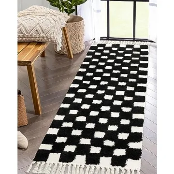 Show moreTransform your living space with the Lahome Checkered Black and White Runner Rug, a perfect blend of style and functionality. This 2x6 runner rug is expertly woven from lightweight cotton, featuring a stunning Moroccan-inspired checkered pattern with tasseled edges for a Boho chic look. Its unique combination of high and low piles not only defines the patterns but also provides a soft underfoot experience, making it ideal for softening floors in any room.