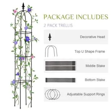Show more Introducing the Lalahoni Garden Trellis, a stunning addition to any garden or indoor space designed for climbing plants. This set of tall and decorative trellises stands at an impressive 67 inches high and 12 inches wide, offering ample support for a variety of climbing plants, including vegetables, flowers, and vines. The unique spiral surface and elegant fleur-de-lis finial at the top not only provide functionality but also add a touch of beauty to your greenery.