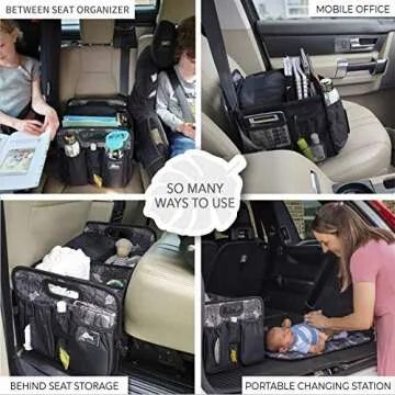 Designed with your family in mind, this organizer isn't just for car storage; it effectively doubles as a portable diaper caddy. Equipped with a changing pad, ample storage for wipes, and pockets for trash bags, it ensures that diaper changes are hassle-free and organized, alleviating the stress of public diaper changes. With dedicated storage for baby bottles, snacks, and toys, it keeps the backseat tidy during family outings.