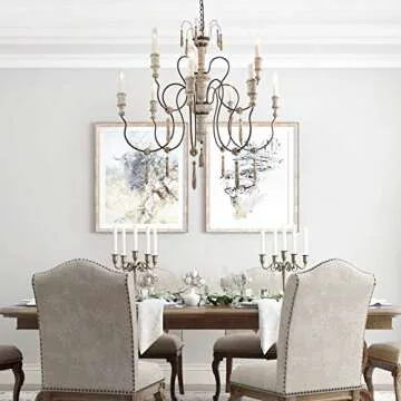Show moreIntroducing the exquisite handmade Farmhouse Chandelier, a stunning centerpiece that seamlessly blends elegance and craftsmanship for your dining room or any spacious area in your home. Each chandelier is distinctively crafted by hand, ensuring that no two pieces are alike—a true representation of artisanal quality. The intricate design draws inspiration from the romantic ambiance of French country style, featuring beautifully imperfect scrolling arms and wooden candle stems adorned with delicate golden tassels. Decorative ornaments, alongside floral sculpted columns and charming wooden drops, encapsulate the understated elegance that characterizes French design.