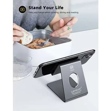 Show moreIntroducing the Lamicall Cell Phone Stand: the perfect blend of style, functionality, and durability designed specifically for your smartphone needs. Crafted with premium aluminium alloy for a sleek and modern look, this phone dock is compatible with a wide range of devices from different brands. Whether you own an iPhone 12 Mini, 11 Pro, XS Max, Galaxy S21 Ultra, S20, or any other Android smartphone, this stand ensures a secure fit for devices sized between 4 to 8 inches. Imagine effortlessly watching your favorite YouTube videos or catching up with loved ones on FaceTime, all while your phone is securely positioned for optimal viewing!