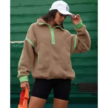 LAMISSCHE Half Zip Sweatshirt Women Oversized Sherpa Jacket V Neck Fleece Pullover Hoodie with Pockets(Khaki,S)