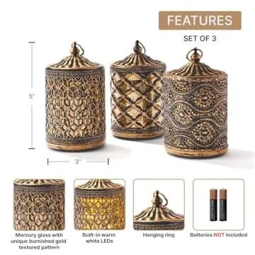 LampLust Small Gold Lanterns: Set of 3 - Warm White LED Light, 5.5 Inch, Battery Operated, Antique Brass Accents, Metal and Glass Moroccan Lamp, Eid & Ramadan Fanoos Decorations or Bohemian Home Decor