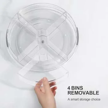 LAMU Lazy Susan Organizer Turntable for Cabinet with 4 Removable Dividers Bins, Rotating Organizer for Medicine Cabinet, Kitchen, Countertop, Pantry, Fridge, Bathroom Counter, 10.6 inch, Clear