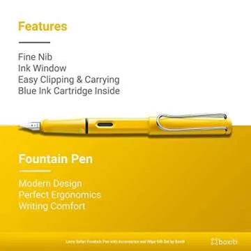 Show moreIntroducing the remarkable Lamy Fountain Pen, a perfect blend of style, comfort, and functionality. This exquisite writing instrument boasts a sleek design and a radiant yellow finish that adds a splash of color to any workspace or writing desk. Made by the reputable Lamy brand, this pen is not only a tool for writing but is also a statement piece that embodies elegance and creativity.