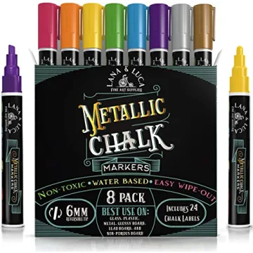Embrace your inner artist with the LANA & LUCA Metallic Liquid Chalk Markers that inspire creativity and fun in every stroke! Whether you're a budding artist or a seasoned pro, these markers enhance your projects and enable you to express yourself like never before. Their vibrant colors and versatile use transform mundane tasks into vibrant masterpieces, making them a valuable addition to your art supplies. You are just a stroke away from transforming your surroundings and experiences into a vibrant canvas!