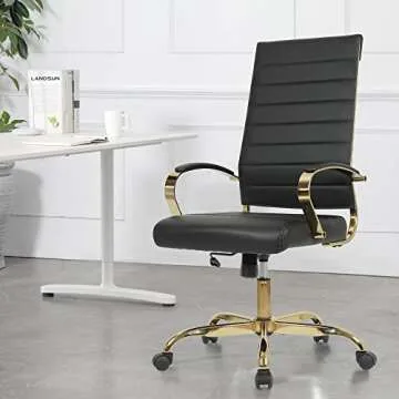 LANDSUN Home Office Chair High Back Executive Chair Ribbed PU Leather Computer Desk Chair with Armrests Soft Padded Adjustable Height Swivel Conference Gold Frame Black
