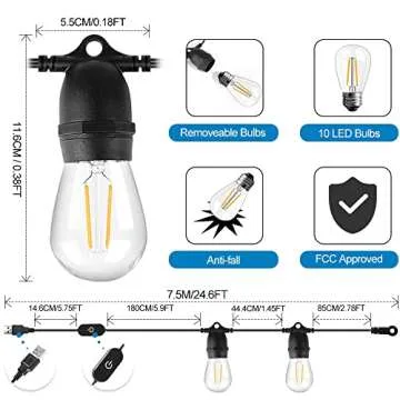 LangPlus+ 24.6Ft USB Powered Outdoor String Lights with 10 pcs Waterproof & Shatterproof S14 LED Bulbs, Lightweight Dimmable Garden Festoon String Lights for Camping BBQ Christmas Party