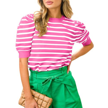 Langwyqu Women's Striped Sweater - Trendy Puff Short Sleeve Crew Neck Top in Bright Pink