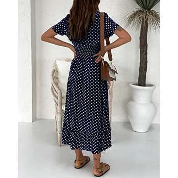 Langwyqu Womens Summer Beach Dress V Neck Short Sleeve Polka Dots Ruffles High Low Dresses