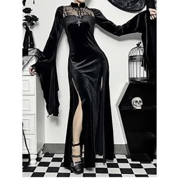 LANSHULAN Long Flare Sleeve Dress Lace Cutout Black Split Goth Vintage Dress Clothes