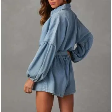 Lantern Long Sleeve Denim Romper for Women Elastic Waist Tie Front Jean Jumpsuit Short Playsuits