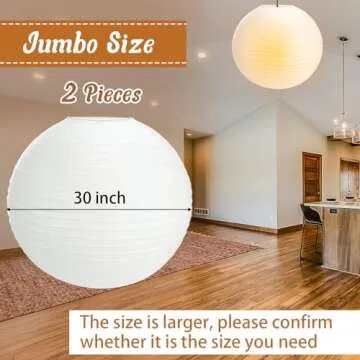 Show more Illuminate your space and create an enchanting ambiance with our Jumbo Paper Lanterns. This set includes 2 stunning large lanterns, each boasting a remarkable diameter of 30 inches. Crafted from quality paper and durable wire, these lanterns are lightweight, sturdy, and won't easily tear, making them a reliable addition to your decor toolkit.