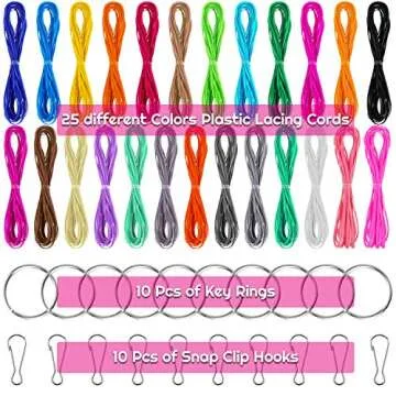 Show more Introducing the Cridoz Lanyard String Kit, your essential companion for all crafting enthusiasts! This delightful set features 25 vibrant colors of high-quality plastic lacing cord, perfect for creating friendship bracelets, lanyards, keychains, and a myriad of DIY projects. Each cord measures approximately 2.5 x 1 mm, providing an ideal flat shape for weaving and crafting. The kit comes accompanied by 10 snap clip hooks and 10 key rings, ensuring you have all the essentials at your fingertips for limitless creative expression.