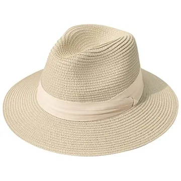 Lanzom Women Wide Brim Straw Panama Roll up Hat Fedora Beach Sun Hat UPF50+ (Z-Beige Ribbon Khaki)