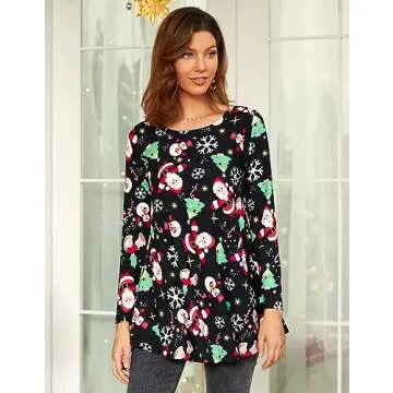 These stylish tunics feature long sleeves, a round neck, and a swing 'A' line hem, making them a beautiful addition to any holiday attire. The basic yet elegant design is tailored to create a slimming effect, and they can even double as maternity wear, providing versatile options for every occasion. With an array of vibrant Christmas prints, these tops will surely make you the star of any festive gathering.