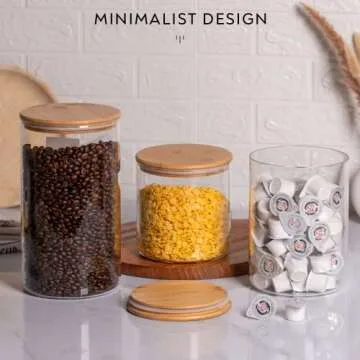 Show more Discover the perfect blend of functionality and aesthetics with the LARAMAID Glass Jar Set. Crafted from high-quality borosilicate glass, these jars come complete with beautifully polished bamboo lids that not only enhance their appearance but also feature a removable sealing ring. This innovative design effectively isolates moisture, ensuring that your spices, herbs, and other ingredients remain dry and fresh. No more worrying about the freshness of your culinary essentials!