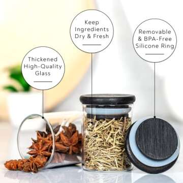 Laramaid 2.5oz 20Pack Spice Jars with Black Vinyl Spice Labels, Round Jars with Black Bamboo Lids, Minimalist Premium Labels, Adjustable Measuring Spoon and White Pen, Storage Container Canisters